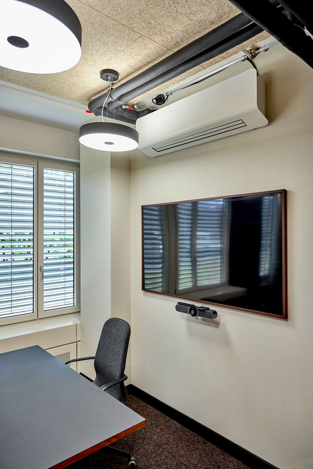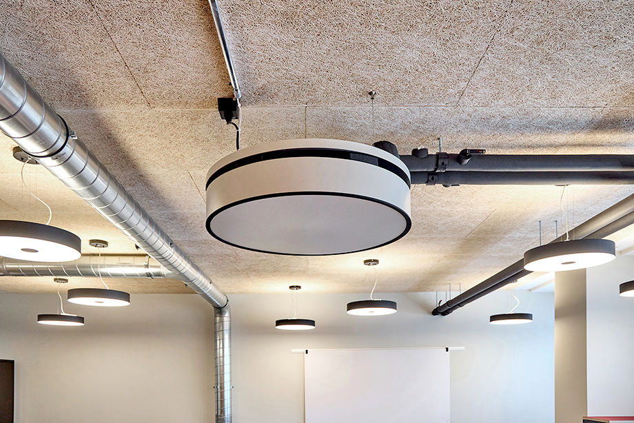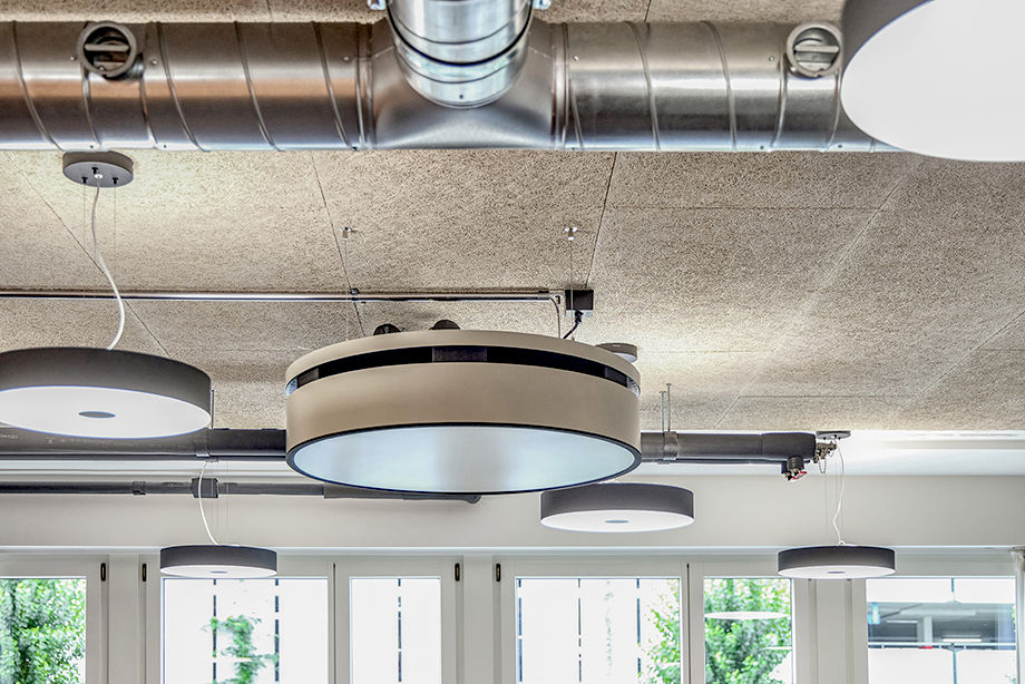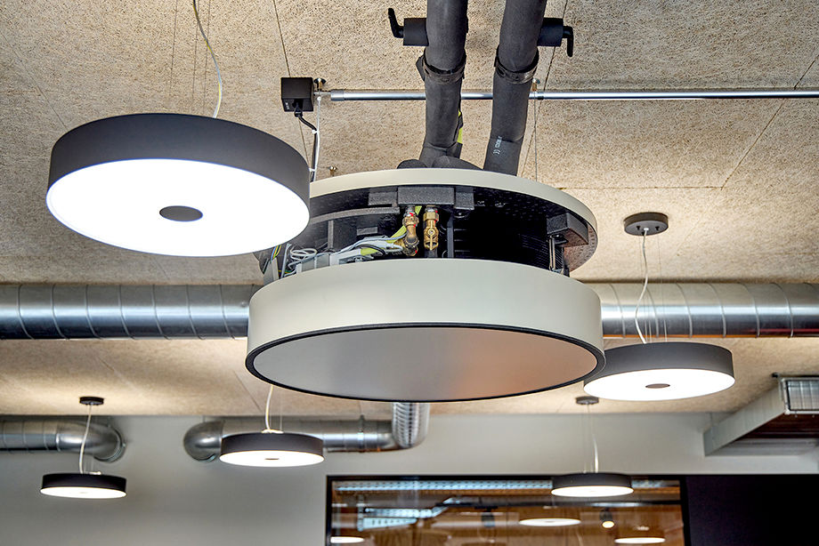 Die runden KaDius fügen sich harmonisch in das architektonische Konzept mit runden Leuchten ein. Dank ihrer dezentralen Funktionsweise lassen sich einzelne Bereiche unabhängig voneinander klimatisieren – ein klarer Vorteil in flexiblen Bürostrukturen wie Co-Working-Spaces.